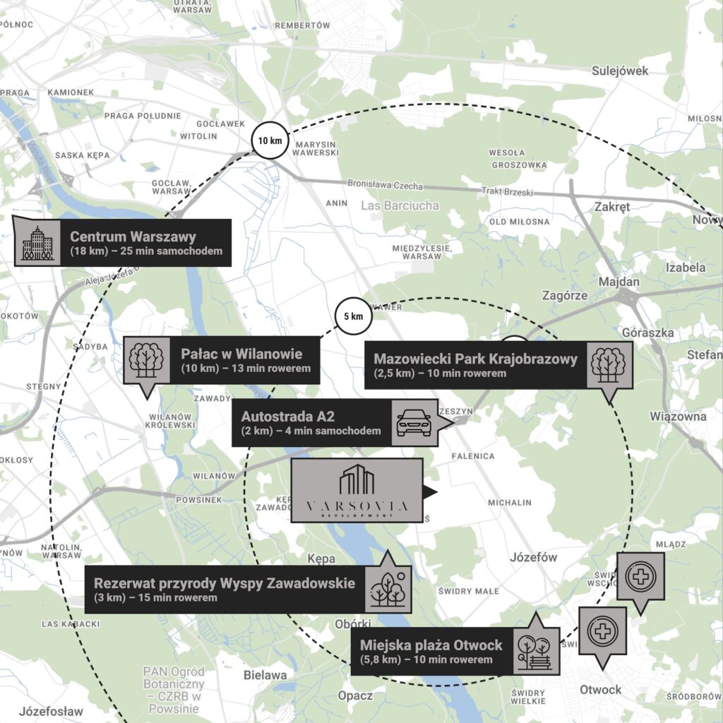 Osiedle Nova Przylaszczkova znajduje się przy ul. Przylaszczkowej w Warszawie. Ta lokalizacja łączy komfort życia w spokojnej, zielonej dzielnicy Wawer z doskonałym skomunikowaniem z centrum miasta. Południowa Obwodnica Warszawy oraz Wał Miedzeszyński pozwalają szybko dotrzeć m.in. do Wilanowa, Mokotowa czy Śródmieścia. W pobliżu znajdują się również liczne linie autobusowe oraz SKM, dzięki którym bez problemu dostaniesz się do kluczowych punktów miasta, unikając korków. Zyskujesz swobodę poruszania się po stolicy, dzięki której oszczędzasz czas!